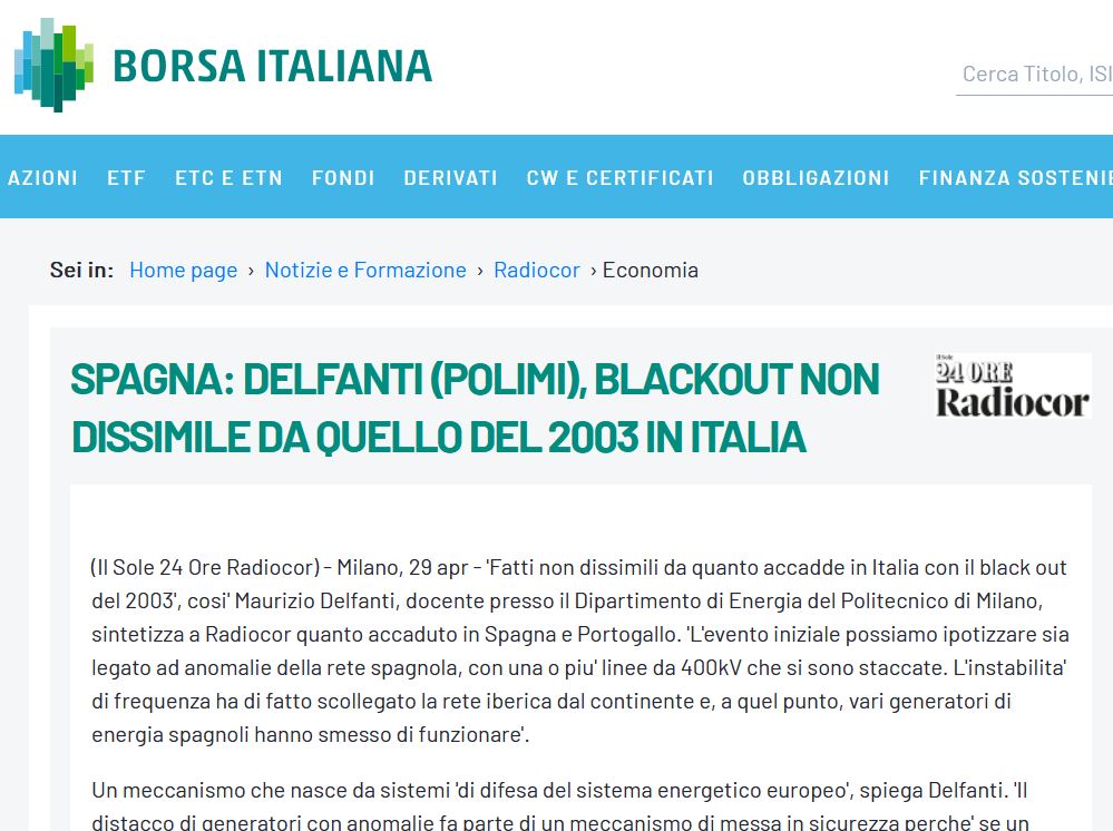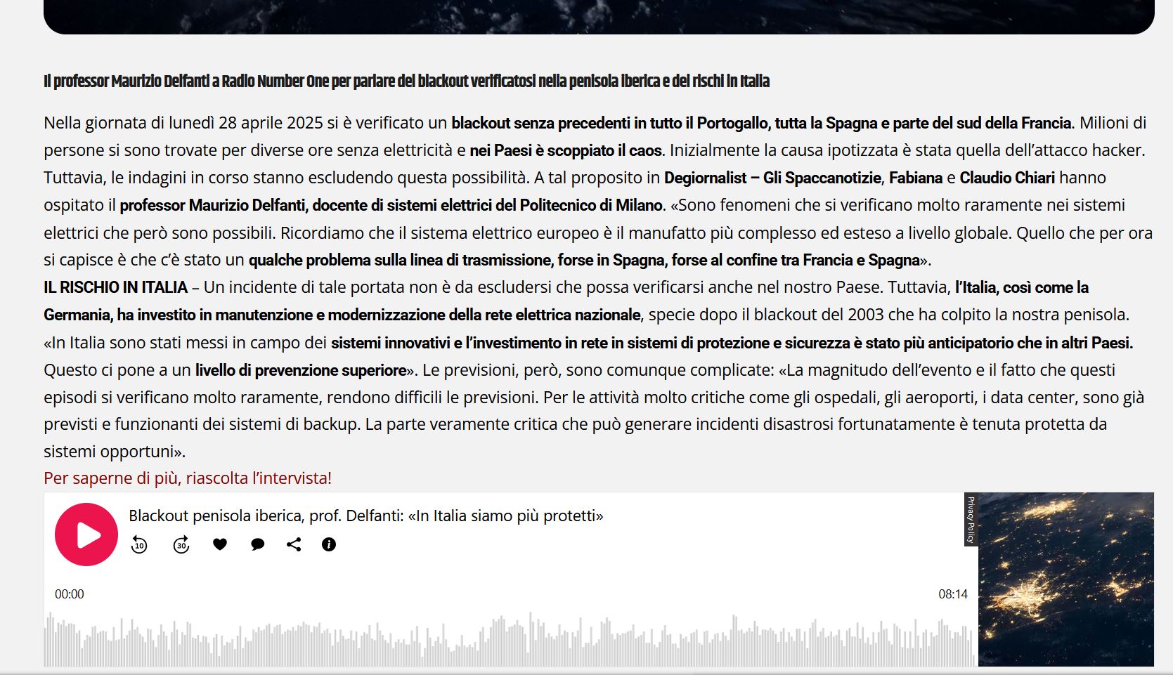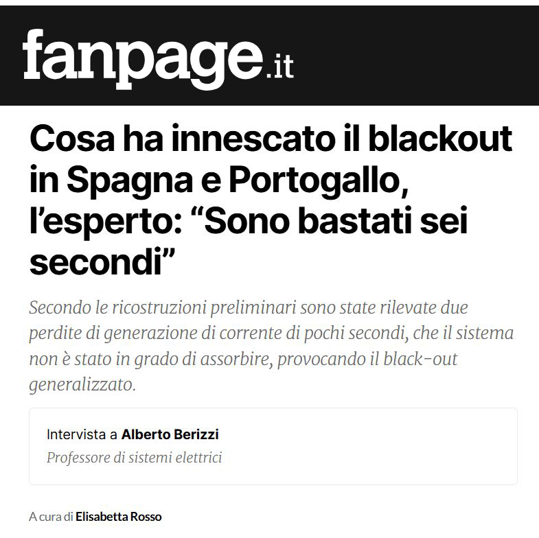 Professor Maurizio Delfanti, also a full professor of Electrical Energy Systems at Politecnico di Milano, contributed to the analysis of the event in the mainstream media, highlighting various structural and risk factors in the Iberian electricity system. In particular, he pointed out that Spain and Portugal share a network that is heavily oriented towards renewable sources, with approximately 60% of installed capacity coming from wind, solar and hydroelectric power, supplemented by nuclear and natural gas plants. This advanced mix, although positive in terms of decarbonisation, entails greater complexity for grid stability. Delfanti also highlighted the limited degree of interconnection between the Iberian and Central European systems – due to orographic barriers and political choices – which may have affected the extent of the blackout. Finally, he commented on the hypothesis, put forward by some media outlets and now under official investigation, of a possible cyber cause for the event. While reiterating the lack of concrete evidence, Delfanti stressed that the high level of digitisation and interconnection of electrical infrastructures exposes them to potential cyber attacks, making it increasingly urgent to strengthen the defence systems of critical networks.