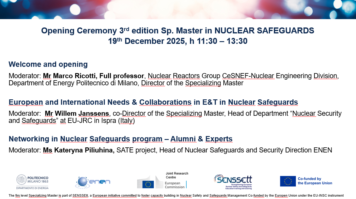 Il 19 dicembre 2025 si è svolta la cerimonia di apertura della III edizione del Master in Nuclear Safeguards, organizzato dal Dipartimento di Energia del Politecnico di Milano in collaborazione con ENEN (European Nuclear Education Network) e JRC Ispra (European Joint Research Centre). Nel progetto sono inoltre coinvolte istituzione accademiche che fanno parte del network ENEN, i partner di ESARDA (Enhancing R&D in Nuclear Safeguards) e altre organizzazioni internazionali (come IAEA).