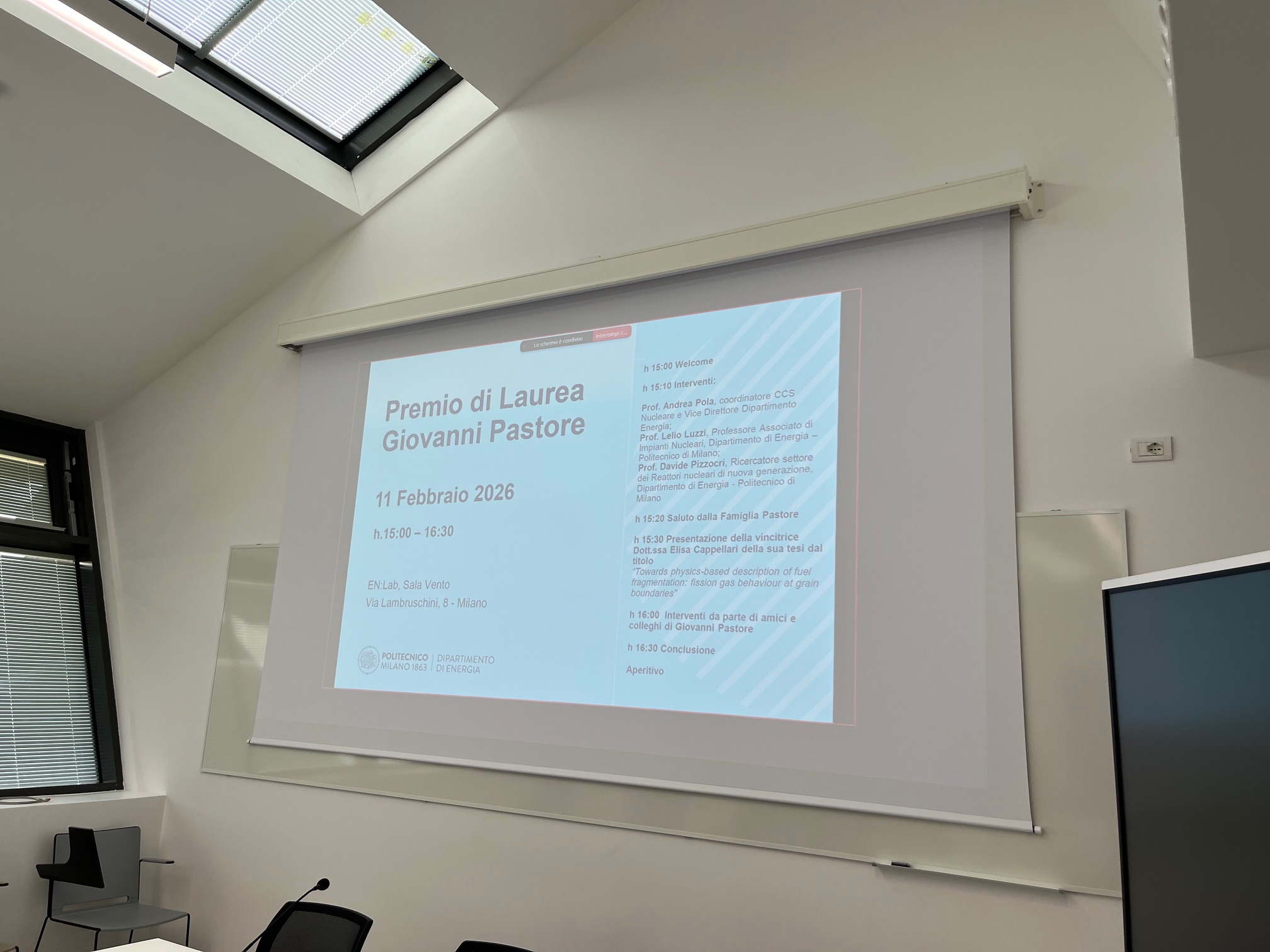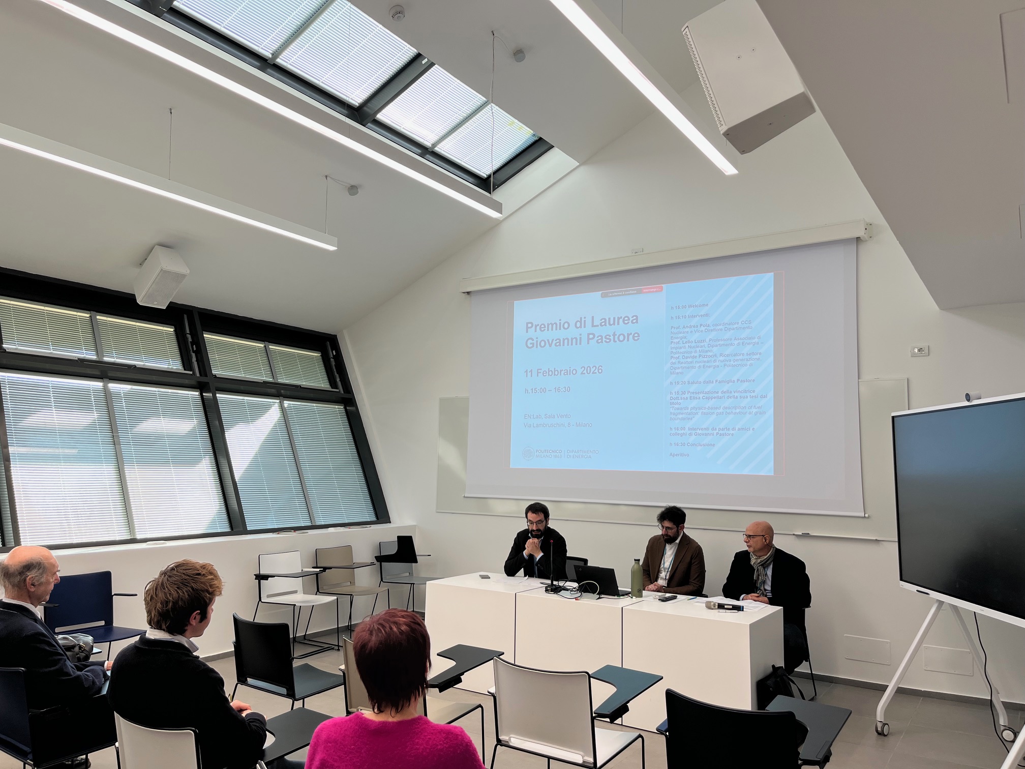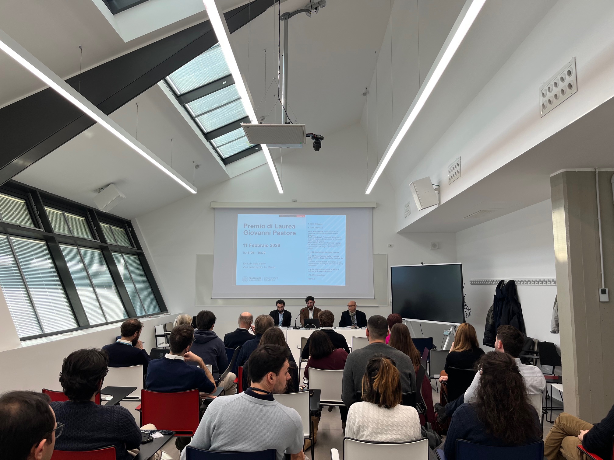 Mercoledì 11 febbraio 2026, presso l’edificio EN:Lab del Dipartimento di Energia del Politecnico di Milano, si è svolta la cerimonia di premiazione della seconda edizione del Premio di Laurea Magistrale “Giovanni Pastore”.