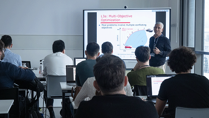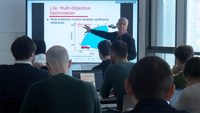 In particolare, il corso ha introdotto in modo sistematico i fondamenti dell’ottimizzazione, i metodi classici e i più recenti approcci di ottimizzazione evolutiva, integrati da esercitazioni pratiche (hands-on). Dopo aver stabilito le basi dei metodi di ottimizzazione a singolo obiettivo (single-objective optimization), sono stati inoltre analizzati i fondamenti e i metodi della ricerca e ottimizzazione multi-criterio (multi-criterion search and optimization), con particolare attenzione agli approcci evolutivi, noti come metodi EMO (Evolutionary Multi-objective Optimization). Successivamente è stata introdotta la selezione di una singola soluzione Pareto-ottimale mediante metodi classici ed evolutivi di decisione multi-criterio (MCDM – Multi-Criteria Decision Making). Infine, sono stati presentati diversi temi avanzati di ricerca, al fine di fornire agli studenti nuovi e innovativi spunti per potenziali attività di ricerca.